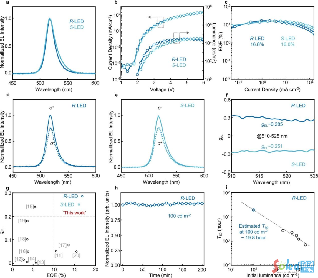 這項研究的核心突破在于,制備出的 R 型器件在綠光波段實現(xiàn)了高達 16.8% 的外量子效率,同時其電致發(fā)光不對稱因子達到了 0.285;S 型器件也分別達到了 16.0% 和 0.251。