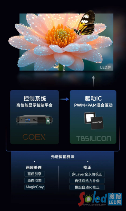 在核心畫(huà)質(zhì)表現(xiàn)上,無(wú)極Infinity展現(xiàn)出極致的技術(shù)實(shí)力:對(duì)比度與動(dòng)態(tài)范圍上,高亮端抬高電流實(shí)現(xiàn)峰值亮度,低灰端降低最小脈寬電流豐富暗場(chǎng)細(xì)節(jié),搭配 16bit PWM+8bit PAM 的理論位深,讓高光與低灰細(xì)節(jié)雙重拉滿(mǎn);刷新率上,通過(guò)PAM拓寬PWM調(diào)制脈寬,使1灰階刷新率較傳統(tǒng)PWM提升4-8倍,輕松實(shí)現(xiàn) 240Hz、360Hz甚至更高刷新率,大幅減少閃爍;色準(zhǔn)上,高精度校正技術(shù)讓色溫穩(wěn)定在 ±100K,色準(zhǔn) ΔE < 2,還原自然真實(shí)色彩;針對(duì)行業(yè)熱痛點(diǎn),搭載溫度預(yù)測(cè)模型實(shí)現(xiàn)逐像素?zé)嵫a(bǔ)償,確保不同溫度下畫(huà)質(zhì)穩(wěn)定。同時(shí),該方案還能減少約 20% 功耗,有效控制溫升,實(shí)現(xiàn)低功耗、低溫升的雙重優(yōu)化,為MLED顯示屏帶來(lái)前所未有的巔峰畫(huà)質(zhì)體驗(yàn)。