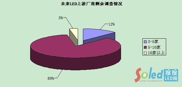 從前半年的情況來分析,相信2014年外延芯片企業(yè)的市場表現(xiàn)會大好于2013年。對于未來將會有多少家芯片企業(yè)存在,80%的調(diào)查對象認(rèn)為芯片環(huán)節(jié)會剩下5-10家企業(yè);12%的調(diào)查對象認(rèn)為會產(chǎn)生寡頭壟斷,剩下3-5家企業(yè)。