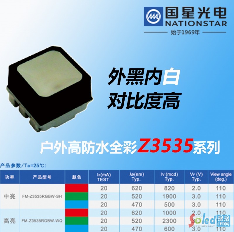國(guó)星光電戶外高防水全彩3535顯示屏器件采用最優(yōu)的高杯矮腳專(zhuān)利設(shè)計(jì), 適合灌膠處理的同時(shí)不影響面罩的設(shè)計(jì);戶外多重防水、防水性能優(yōu)異,同時(shí)還具有防塵、防紫外性能;緊湊型設(shè)計(jì),可廣泛運(yùn)用到戶外高密度顯示屏P6-P10的設(shè)計(jì)上。國(guó)星光電SMD LED器件具有防水性能好,抗UV等特點(diǎn),能夠輕松實(shí)現(xiàn)全戶外應(yīng)用。