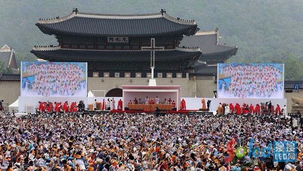 8月16日上午,教皇方濟(jì)各在韓國(guó)“國(guó)門(mén)”——光化門(mén)主持“韓國(guó)124名殉教者宣福禮”。在韓國(guó)首爾市政府大樓至光化門(mén)長(zhǎng)達(dá)4.5公里的廣場(chǎng)大道兩旁,一共安裝了26塊“魔幻舞臺(tái)”戶外全彩屏, 這些顯示屏均選用的是國(guó)星光電戶外高防水全彩3535系列器件。國(guó)星光電3535器件為這些全彩LED顯示屏提供了出色、穩(wěn)定的高清畫(huà)面,全方位接受百萬(wàn)韓國(guó)人民觀看。
