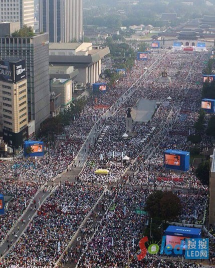 核心提示:8月16日上午,教皇方濟(jì)各在韓國(guó)“國(guó)門(mén)”——光化門(mén)主持“韓國(guó)124名殉教者宣福禮”。在韓國(guó)首爾市政府大樓至光化門(mén)長(zhǎng)達(dá)4.5公里的廣場(chǎng)大道兩旁,一共安裝了26塊“魔幻舞臺(tái)”戶外全彩屏, 這些顯示屏均選用的是國(guó)星光電戶外高防水全彩3535系列器件。