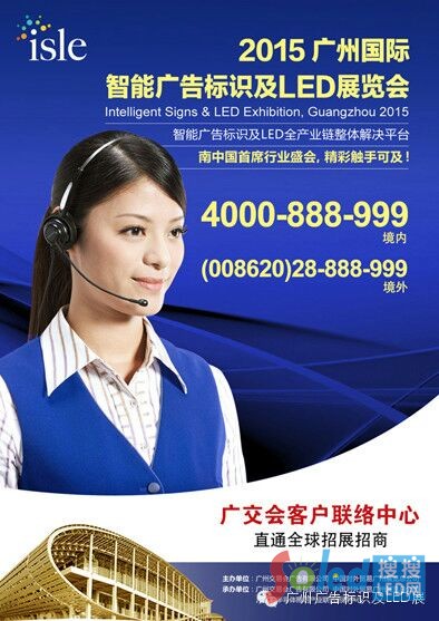 無限商機,意想不到的驚喜,期待您參與2015.3.1-3.4日廣交會展館“2015廣州國際智能廣告標識及LED展覽會”。了解詳情及展位訂購請咨詢020-89268256、020-89268241、020-89268293、020-89268239或登錄官方網站www.isle.org.cn。