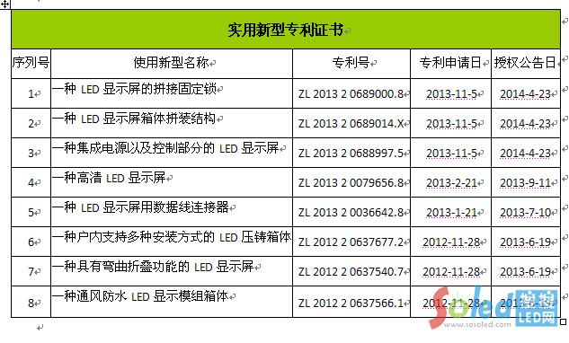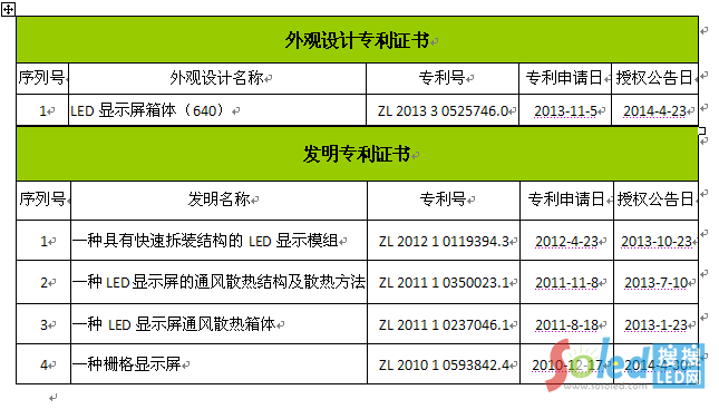 齊普光電于近年陸續(xù)取得國家知識產(chǎn)權局頒發(fā)的專利證書,包括LED顯示屏箱體(640)、LED顯示屏通用鑄鋁箱體、一種集成電源以及控制部分的LED顯示屏、一種高清LED顯示屏等28項LED顯示相關發(fā)明專利。目前擁有外觀設計專利6項,發(fā)明專利7項,實用新型專利15項。