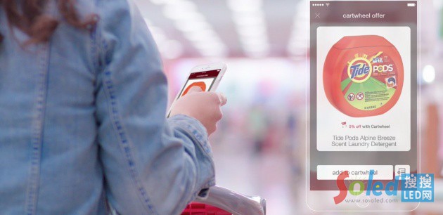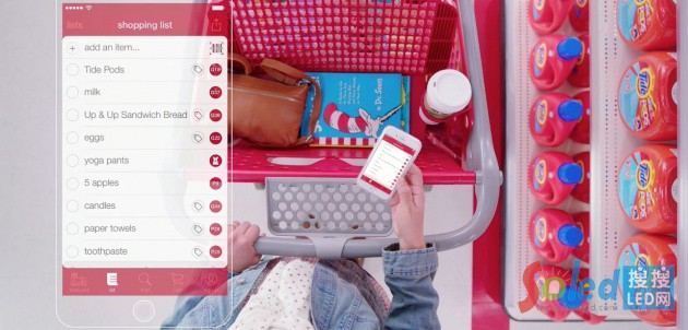 Target網(wǎng)站彈出的宣傳視頻中顯示了一個年輕購物者進入商店后大部分的時間都在邊推購物車邊將手機朝上對著燈光,首先彈出免費送一杯星巴克咖啡的信息,然后顯示了最快前往洗滌用品的路線,她到達后并將各種肥皂的比較信息送達手機。高效率、輕松活潑的購物旅程結(jié)束后,手機及其應(yīng)用程序還能幫助她在收銀臺付款。