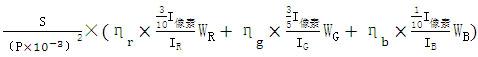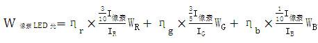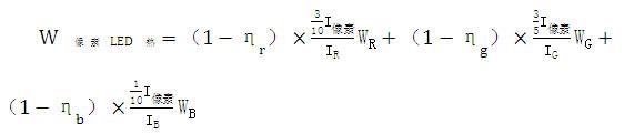 設(shè)上述R、G、BLED燈珠芯片的電光轉(zhuǎn)換效率分別為ηr、ηg和ηb(電光轉(zhuǎn)換效率LED芯片將電能轉(zhuǎn)變?yōu)楣饽艿男剩。則上述每像素RGBLED輻射的光功率為: