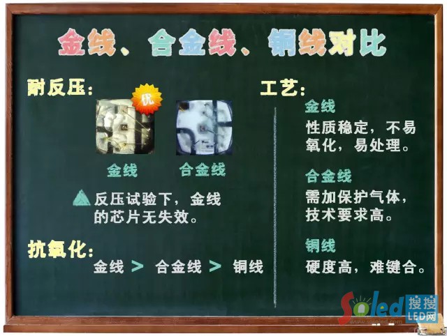 LED燈需要通過連接線將芯片與引腳導(dǎo)通作為電流的通道,而鍵合線就充當(dāng)著這個連接線。與支架合金一樣,鍵合線也是器件的重要組成部分,其優(yōu)劣直接影響燈管品質(zhì)。廠商最常用的鍵合線有銅線、合金線和純金線。下面我們來對比一下三種金屬的鍵合線有什么差別。