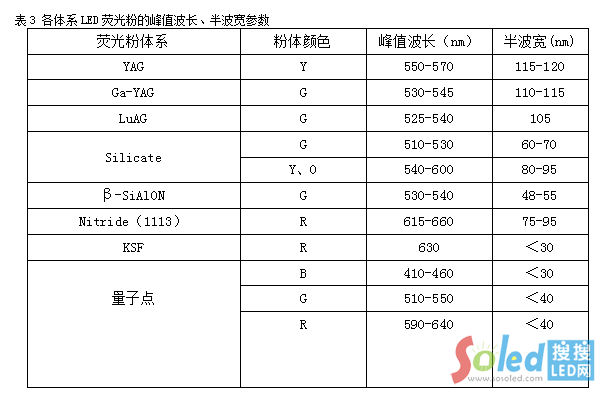 以峰值波長、半波寬來進行區(qū)分,不同體系的LED熒光粉特點可以總結(jié)如下表3: