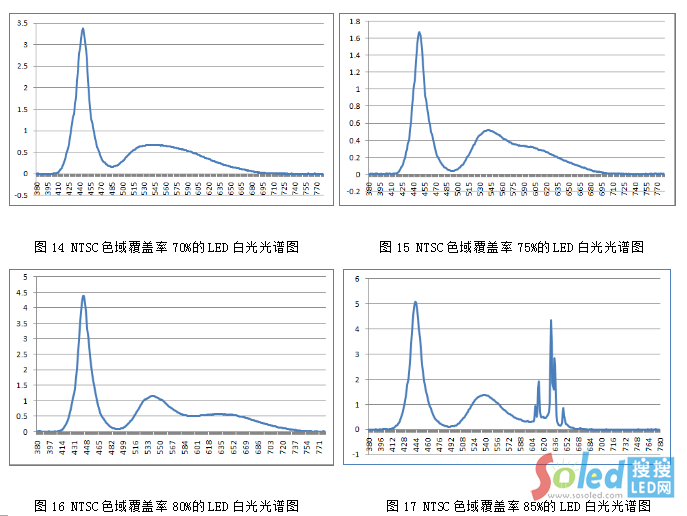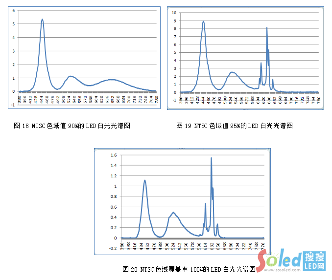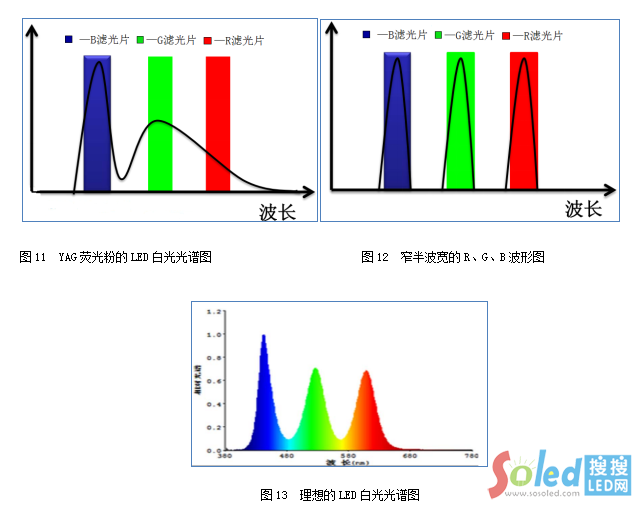 分析2、因熒光粉封裝成LED白光后是由RGB構(gòu)成的一個連續(xù)波形(圖11),為了使白光能更好的匹配CF,則需3個較窄半波寬的R、G、B、波形(圖12)。當(dāng)熒光粉的半波寬越窄時,其整個光譜則趨向于單色光的光譜,此時此熒光粉的色純度則越高,由此類熒光粉混合成的白光光譜則越接近理想的白光光譜(圖13),這樣的白光透過CF后,色域覆蓋率高。