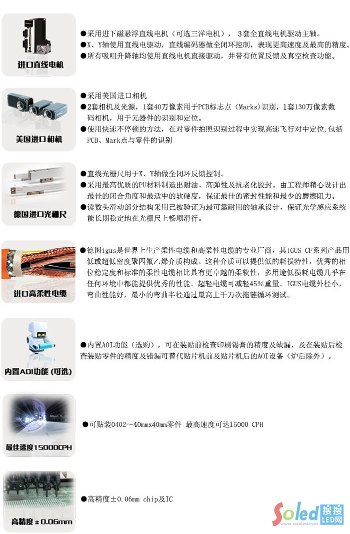 ● 滿足國(guó)內(nèi)電子廠、SMT加工廠、LED應(yīng)用廠商,LED燈具廠商貼裝LED3528,5050,3014 , 0402,0603、0805、1206、1210,1W大功率,3W大功率,IC等器件、封裝器件二級(jí)管、三極管等,有效的提高了貼裝的精度和效率,節(jié)省大量人工成本。