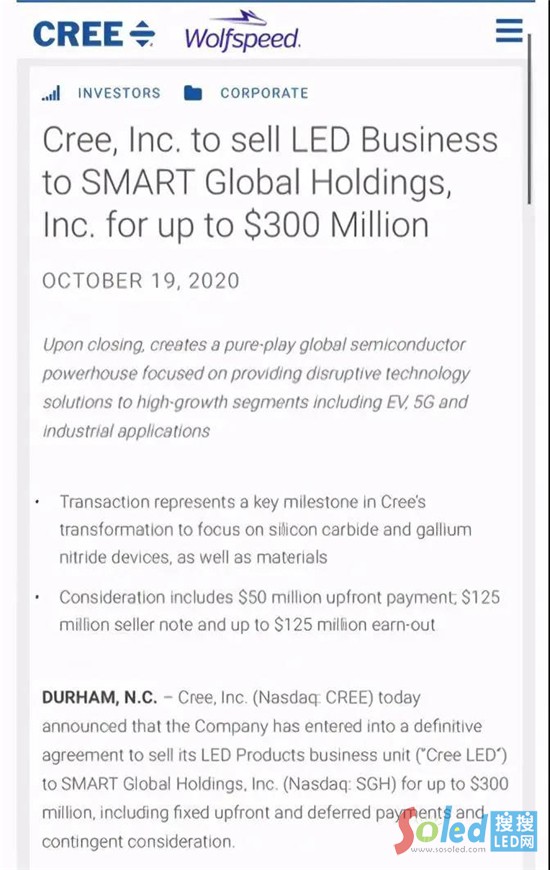 就在2019年5月13日,Cree宣布向美國(guó)理想工業(yè)公司(IDEAL INDUSTRIES)出售其照明產(chǎn)品業(yè)務(wù)部門(“Cree Lighting”),包括用于商業(yè)、工業(yè)和消費(fèi)者應(yīng)用的LED照明燈具、燈泡以及企業(yè)照明解決方案業(yè)務(wù),徹底告別照明業(yè)務(wù)。